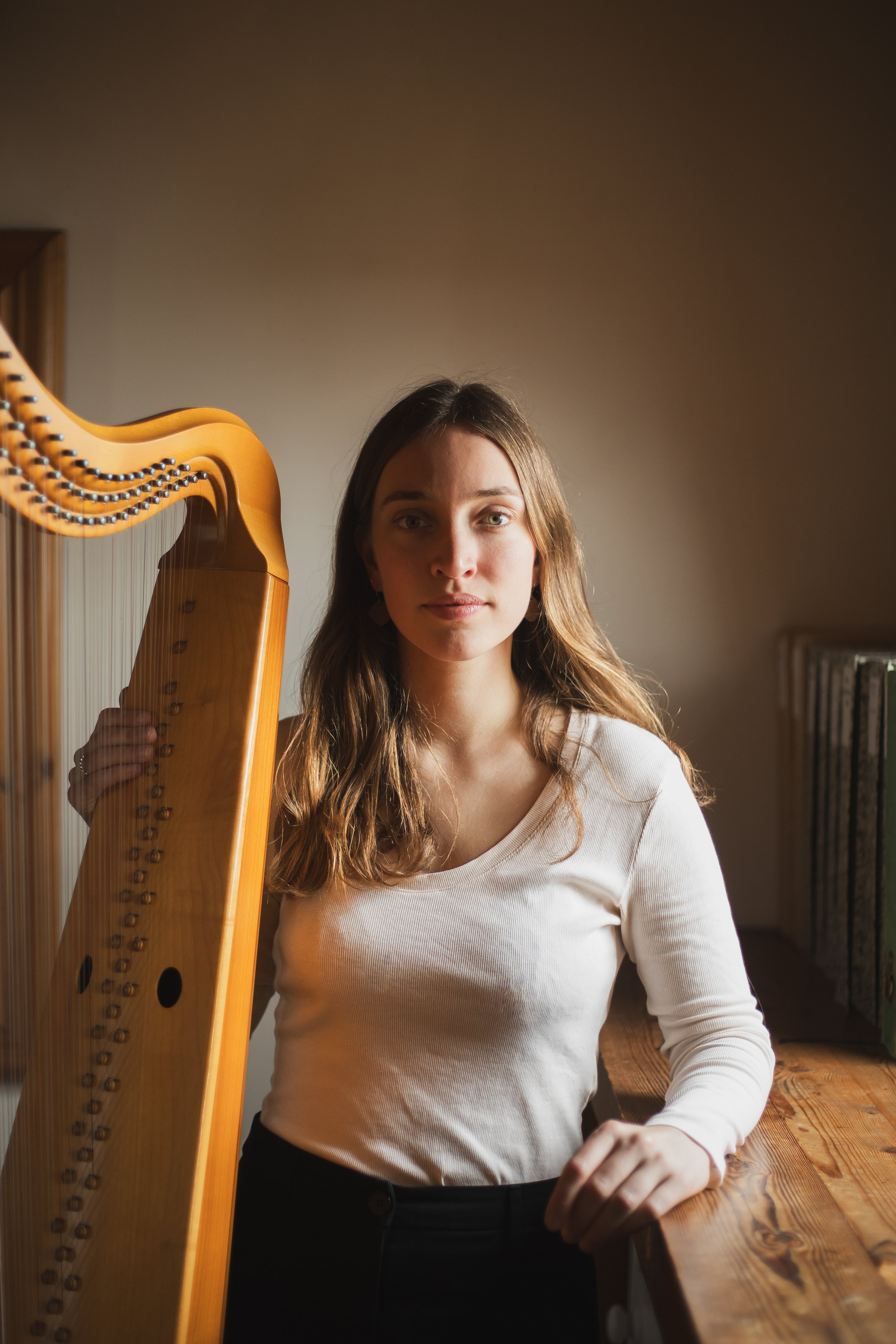 Lise lives with her harps on a blue houseboat on the London canals. When she is not playing the harp, she loves to knit jumpers and run along the canal.